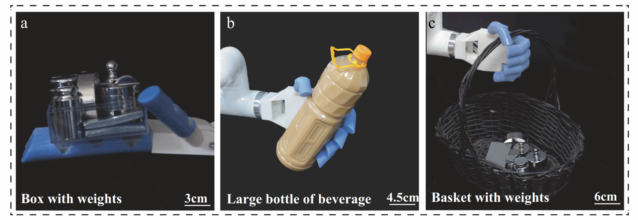 图6 装有刚-柔-软结构手指的仿人机械手及其负重能力