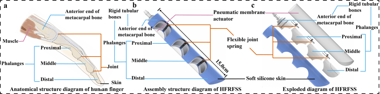 如今,设计一种兼具刚性手指的高承载能力与柔性手指的灵活性和安全性,同时保持结构简单且适用范围广,尤其适用于超薄或超脆物体的仿生手指,仍是一项具有挑战性的任务。本研究受人类手指刚柔并济结构(图1a)的启发,设计了一款刚-柔-软结构仿人手指(图1b)。