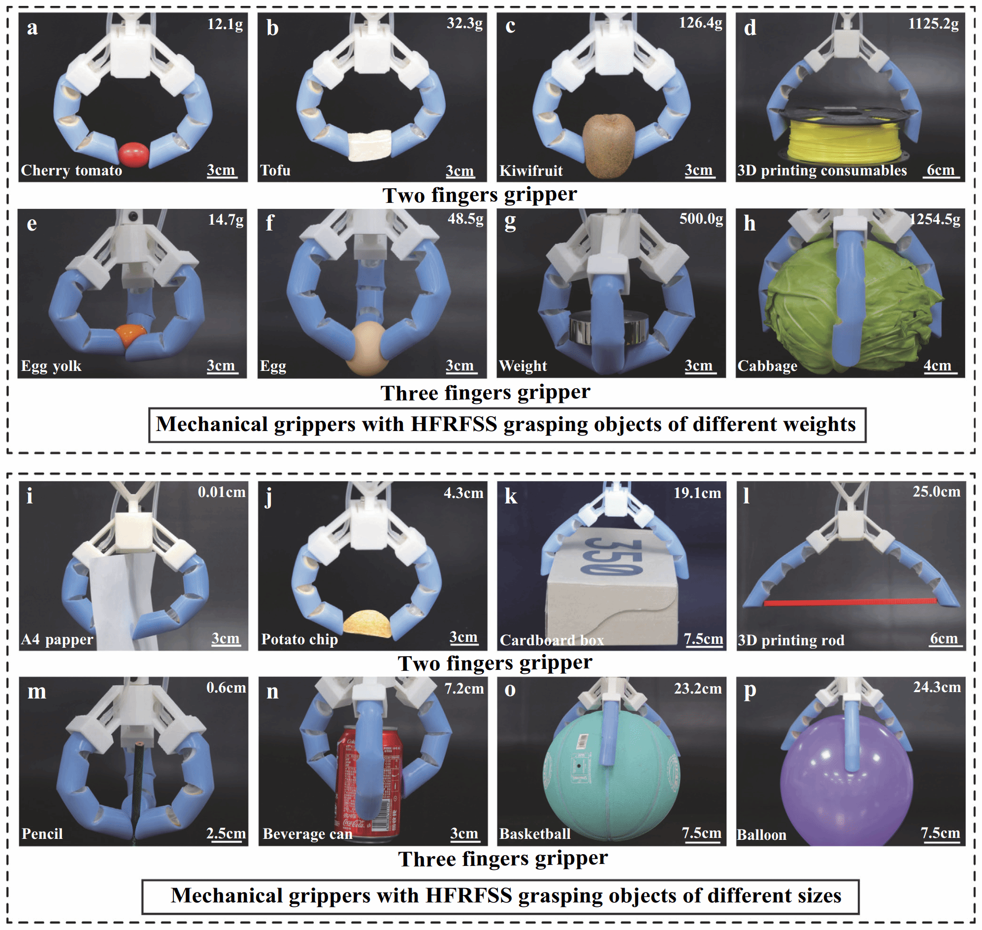 研究团队通过大量实验验证了装有该仿人手指的抓持器在广泛的质量、硬度、尺寸和形状范围内具有卓越的抓取能力。图2a至2d展示了双指抓持器逐步抓取越来越重的物体,从轻柔地抓取12.1克的小番茄开始,最终成功抓取了重达1125.2克的3D 打印耗材。同样,图2e至2h表明三指抓持器不仅能轻柔地抓取14.7克的生鸡蛋黄而不损坏,还能牢牢地握住1254.5克的卷心菜。此外,图2i至 2l展示了双指抓持器从抓取0.01厘米厚的A4纸到抓取25.0厘米长的3D打印棒的过程,而图2m至2p则展示了三指抓持器抓取从0.6厘米直径的铅笔到24.3厘米大的柔软且易破的气球等不同物体的能力。